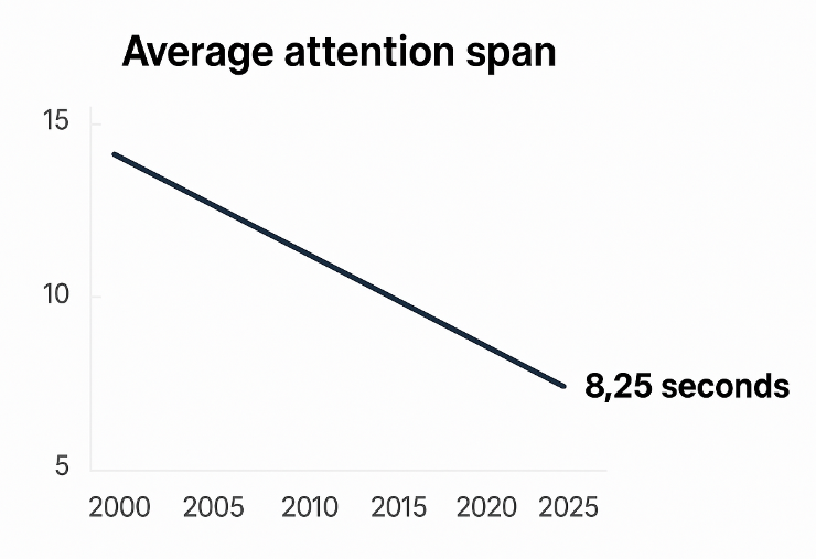 Line chart showing decrease in average attention span over recent years down to 8.25 seconds in 2025
